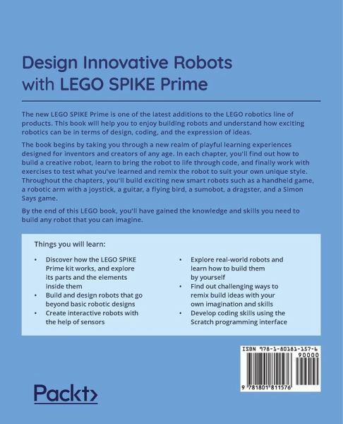Discover how to use the LEGO SPIKE Prime kit and boost your confidence in robotics, coding, and engineering Key Features:Get up and running with new parts not seen in previous LEGO kits Gain deeper insights into non-compatible sensors and components that work with all prior LEGO components and third-party elements Explore new features and experiment with new robot builds with LEGO's new coding platform Book Description: The new LEGO SPIKE Prime is one of the latest additions to the LEGO robotics line of products. This book will help you to enjoy building robots and understand how exciting robotics can be in terms of design, coding, and the expression of ideas. The book begins by taking you through a new realm of playful learning experiences designed for inventors and creators of any age. In each chapter, you'll find out how to build a creative robot, learn to bring the robot to life through code, and finally work with exercises to test what you've learned and remix the robot to suit your own unique style. Throughout the chapters, you'll build exciting new smart robots such as a handheld game, a robotic arm with a joystick, a guitar, a flying bird, a sumobot, a dragster, and a Simon Says game. By the end of this LEGO book, you'll have gained the knowledge and skills you need to build any robot that you can imagine. What You Will Learn:Discover how the LEGO SPIKE Prime kit works, and explore its parts and the elements inside them Build and design robots that go beyond basic robotic designs Create interactive robots with the help of sensors Explore real-world robots and learn how to build them by yourself Find out challenging ways to remix build ideas with your own imagination and skills Develop coding skills using the Scratch programming interface Who this book is for: This book is for robot enthusiasts, LEGO lovers, hobbyists, educators, students, and anyone looking to learn about the new LEGO SPIKE Prime kit. The book is designed to go beyond the basic builds to intermediate and advanced builds, while also helping you to learn how to add your own personal touch to the builds and code. To make the most of this book, you'll need a basic understanding of build techniques, coding in block-based software environments, and weaving them together to create unique robot builds.