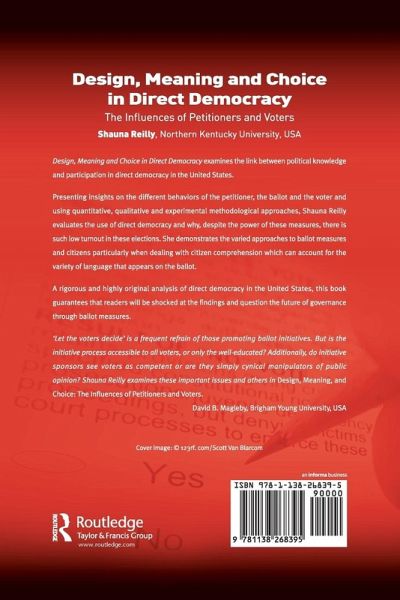 Design, Meaning and Choice in Direct Democracy examines the link between political knowledge and participation in direct democracy in the United States. Presenting insights on the different behaviours of the petitioner, the ballot and the voter and using quantitative, qualitative and experimental methodological approaches, Shauna Reilly evaluates the use of direct democracy and why, despite the power of these measures, there is such low turnout in these elections. She demonstrates the varied approaches to ballot measures and citizens particularly when dealing with citizen comprehension which can account for the variety of language that appears on the ballot. A rigorous and highly original analysis of direct democracy in the United States, this book guarantees that readers will be shocked at the findings and question the future of governance through ballot measures.