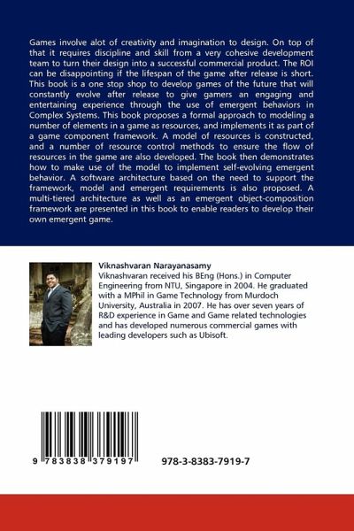 Games involve alot of creativity and imagination to design. On top of that it requires discipline and skill from a very cohesive development team to turn their design into a successful commercial product. The ROI can be disappointing if the lifespan of the game after release is short. This book is a one stop shop to develop games of the future that will constantly evolve after release to give gamers an engaging and entertaining experience through the use of emergent behaviors in Complex Systems. This book proposes a formal approach to modeling a number of elements in a game as resources, and implements it as part of a game component framework. A model of resources is constructed, and a number of resource control methods to ensure the flow of resources in the game are also developed. The book then demonstrates how to make use of the model to implement self-evolving emergent behavior. A software architecture based on the need to support the framework, model and emergent requirements is also proposed. A multi-tiered architecture as well as an emergent object-composition framework are presented in this book to enable readers to develop their own emergent game.