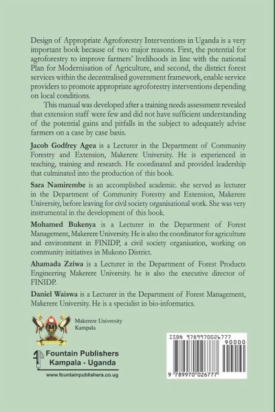 The design of appropriate agroforesty intervention in Uganda has the potential to improve farmer¿s livelihoods in line with the national Plan for Modernisation of Agriculture; and district forest services within the decentralised government framework, enable service providers to promote appropriate agroforestry interventions depending on local conditions. It was against this background that this manual was developed. A training needs assessment revealed that extension staff were few and did not have sufficient understanding of the potential gains and pitfalls to adequately advise farmers on a case by case basis.