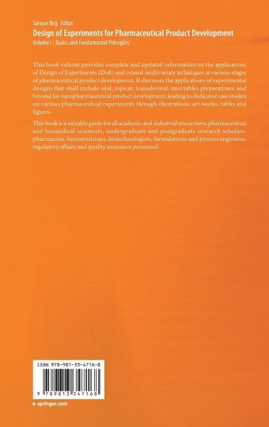 This book volume provides complete and updated information on the applications of Design of Experiments (DoE) and related multivariate techniques at various stages of pharmaceutical product development. It discusses the applications of experimental designs that shall include oral, topical, transdermal, injectables preparations, and beyond for nanopharmaceutical product development, leading to dedicated case studies on various pharmaceutical experiments through illustrations, art-works, tables and figures. This book is a valuable guide for all academic and industrial researchers, pharmaceutical and biomedical scientists, undergraduate and postgraduate research scholars, pharmacists, biostatisticians, biotechnologists, formulations and process engineers, regulatory affairs and quality assurance personnel.