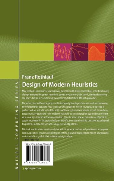 "The book on modern heuristic methods by Franz Rothlauf is very special as it has very strong practical flavour - it teaches us how to design efficient and effective modern heuristics to solve a particular problem. This empasis on design component resulted in in-depth discussion on topics like: for which types of problems we should use modern heuristics, how we can select a modern heuristic that is well-suited to our problem, what are basic principles for the design of modern heuristics, and how we can use problem-specific knowledge for the design of modern heuristics? I recommend this book highly to the whole optimization research community and, in particular, to every practitioner who is interested in the applicability of modern heuristic methods." -- Zbigniew Michalewicz, University of Adelaide, author of "How to Solve It: Modern Heuristics"
