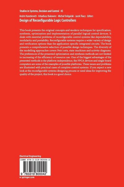 This book presents the original concepts andmodern techniques for specification, synthesis, optimisation and implementationof parallel logical control devices. It deals with essential problems ofreconfigurable control systems like dependability, modularity and portability.Reconfigurable systems require a wider variety of design and verification optionsthan the application-specific integrated circuits. The book presents acomprehensive selection of possible design techniques. The diversity of themodelling approaches covers Petri nets, state machines and activity diagrams.The preferences of the presented optimization and synthesis methods arenot limited to increasing of the efficiency of resource use. One of the biggestadvantages of the presented methods is the platform independence, the FPGAdevices and single board computers are some of the examples of possibleplatforms. These issues and problems are illustrated with practical cases ofcomplete control systems. If you expect a new look at the reconfigurablesystems designing process or need ideas for improving the quality of theproject, this book is a good choice.g process or needideas for improving the quality of the project, this book is a good choice.