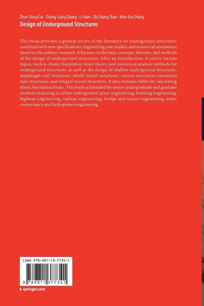 This book provides a general review of the literature on underground structures, combined with new specifications, engineering case studies, and numerical simulations based on the authors' research. It focuses on the basic concepts, theories, and methods of the design of underground structures. After an introduction, it covers various topics, such as elastic foundation beam theory and numerical analysis methods for underground structures, as well as the design of shallow underground structures, diaphragm wall structures, shield tunnel structures, caisson structures, immersed tube structures, and integral tunnel structures. It also includes tables for calculating elastic foundation beam. This book is intended for senior undergraduate and graduate students majoring in urban underground space engineering, building engineering, highway engineering, railway engineering, bridge and tunnel engineering, water conservancy and hydropower engineering.