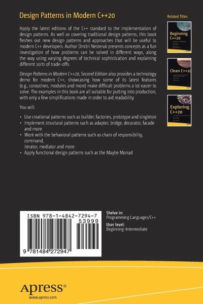Design Patterns in Modern C++20, Second Edition also provides a technology demo for modern C++, showcasing how some of its latest features (e.g., coroutines, modules and more) make difficult problems a lot easier to solve. The examples in this book are all suitable for putting into production, with only a few simplifications made in order to aid readability.