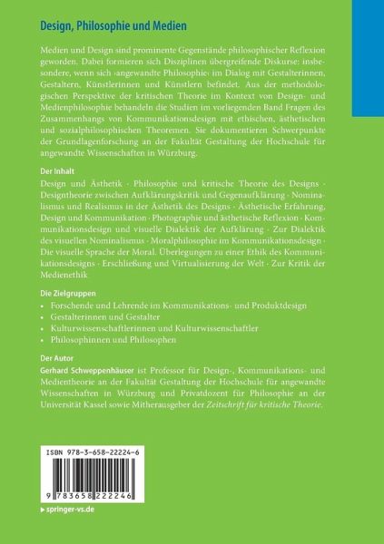 Design und Ästhetik.- Philosophie und kritische Theorie des Designs.- Designtheorie zwischen Aufklärungskritik und Gegenaufklärung.- Nominalismus und Realismus in der Ästhetik des Designs.- Ästhetische Erfahrung, Design und Kommunikation.- Photographie und ästhetische Reflexion.- Kommunikationsdesign und visuelle Dialektik der Aufklärung.- Zur Dialektik des visuellen Nominalismus.- Moralphilosophie im Kommunikationsdesign.- Die visuelle Sprache der Moral. Überlegungen zu einer Ethik des Kommunikationsdesigns.- Erschließung und Virtualisierung der Welt.- Zur Kritik der Medienethik.