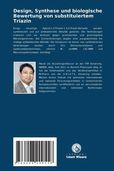 Einige neuartige Hybrid-1,3-Thiazin-1,3,5-Triazin-Derivate wurden synthetisiert und auf antibakterielle Aktivität getestet. Die Verbindungen erwiesen sich als wirksam gegen grampositive und gramnegative Mikroorganismen. Die Zielverbindungen zeigten eine ausgezeichnete bis mäßige antibakterielle Aktivität. Die Strukturen all dieser neu synthetisierten Verbindungen wurden durch ihre Elementaranalysen und Spektraldatentechniken, nämlich IR, 1H-NMR, 13C-NMR und Massenspektroskopie, bestätigt.