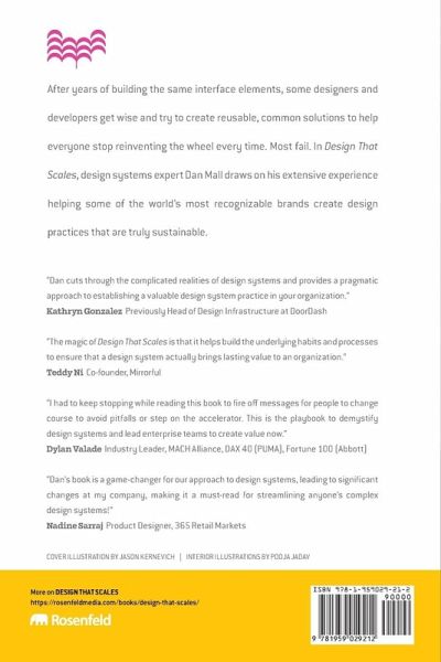After years of building the same interface elements, some designers and developers get wise and try to create reusable, common solutions to help everyone stop reinventing the wheel every time. Most fail. In Design That Scales, design systems expert Dan Mall draws on his extensive experience helping some of the world's most recognizable brands create design practices that are truly sustainable and successful. "Dan's book is a game-changer for our approach to design systems, leading to significant changes at my company, making it a must-read for streamlining anyone's complex design systems!" --Nadine Sarraj, Product Designer, 365 Retail Markets "A lively and paradigm-challenging evaluation of what makes good system designs work at any scale."--Kirkus Reviews Who Should Read This Book? People who are building and maintaining design systems, large or small. Designers, engineers, and product managers who are in search of a more efficient way to work. Leaders and executives who want to effect change but aren't sure how to do it. People who have designed web forms and tables, but don't know what's next. Takeaways * A design system is crucial for any organization managing two or more digital products. Learn how to create, manage, and sustain a successful design system. * See how the ecosystem of a design system works in order to understand the context for success. * Figure out where the people involved in a design system fit and how they can best collaborate. * Learn the metrics for success within a design system and how to measure them. * Determine the best techniques for marketing your design system to stakeholders. * Learn what guidance and relationships are crucial for a design system to succeed. * See the end-of-chapter questions that highlight how to guide your design system to a profitable outcome.