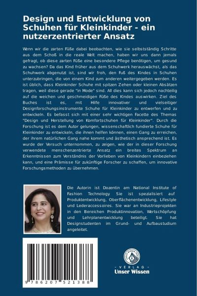 Wenn wir die zarten Füße dabei beobachten, wie sie selbstständig Schritte aus dem Schoß in die reale Welt machen, haben wir uns dann jemals gefragt, ob diese zarten Füße eine besondere Pflege benötigen, um gesund zu wachsen? Da das Kind früher aus dem Schuhwerk herauswächst, als das Schuhwerk abgenutzt ist, sind wir froh, den Fuß des Kindes in Schuhen unterzubringen, die von einem Kind zum anderen weitergegeben werden. Es ist üblich, dass Kleinkinder Schuhe mit spitzen Zehen oder kleinen Absätzen tragen, weil diese gerade "in Mode" sind. All dies kann sich jedoch nachteilig auf die weichen und geschmeidigen Füße des Kindes auswirken. Ziel des Buches ist es, mit Hilfe innovativer und vielseitiger Designforschungsinstrumente Schuhe für Kleinkinder zu entwerfen und zu entwickeln. Es befasst sich mit einer sehr wichtigen Facette des Themas "Design und Herstellung von Komfortschuhen für Kleinkinder". Durch die Forschung ist es dem Autor gelungen, wissenschaftlich fundierte Schuhe für Kleinkinder zu entwickeln, die ihnen helfen können, einen Gang zu erreichen, der ihrem natürlichen Gang nahe kommt und ästhetisch ansprechend ist. Es wurde der Versuch unternommen, zu zeigen, wie der in dieser Forschung verwendete menschenzentrierte Ansatz ein breites Spektrum an Erkenntnissen zum Verständnis der Vorlieben von Kleinkindern einbeziehen kann, und eine Prämisse für zukünftige Forscher zu schaffen, um innovative Forschungsmethoden zu übernehmen.