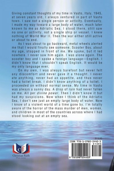 Giving constant thoughts of my time in Vasto, Italy, 1945, at seven years old, I always ventured in part of Vasto town. I saw not a single person or activity. Eventually, I made my way toward a large body of water, much later known to me as Adriatic Sea. I stood there, still saw no one or activity, not a single ship or vessel. I knew nothing of World War II. Then the war either still active or about to end. As I was about to go backward, metal wheels alerted me that I would finally see someone. Scooter Boy, about my age, stopped in front of me. We spoke, but it led nowhere. I never saw him again. I was alone again. The scooter boy and I spoke a foreign language-English. I didn't know that I shouldn't speak English. It would be my only language ever. On my own, I was always barefoot but never felt any discomfort and never gave it a thought. I never ate anything, never had an appetite, and thus never had a toilet break. I didn't know anything of a toilet. I proceeded on without normal sense. My time in Vasto was always a sunny day. A drop of rain had never fallen on me. All per divine power. Then I didn't know it but had my suspicions. Now when I think of the Adriatic Sea, I don't see just an empty large body of water. Now I know of a violent world of a time gone by. I'm totally aware of the horror of the mass murder of men, women, and children in most of the countries across where I had stood looking out at an empty sea.