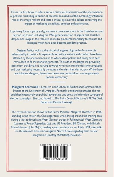 This is the first book to offer a serious examination of the phenomenon of political marketing in Britain. It presents an analysis of the increasingly influential role of the image-makers and casts a critical eye over the debate concerning the impact of marketing on political conduct and governance. Its primary focus is party and government communications in the Thatcher era and beyond, up to and including the 1992 general election. It argues that Thatcher, despite her image as the resolute politician, pioneered marketing techniques and concepts which have since become standard practice. Designer Politics looks at the historical engines of growth of commercial salesmanship in politics. It explores how political culture and conduct have been affected by the phenomenon and to what extent politics and policy have been remoulded to fit the marketing process. The author challenges the prevailing pessimism that Britain is hurtling towards American presidential-style campaigns and that marketing necessarily demeans and undermines democracy. While there are inherent dangers, there also comes new potential for a more genuinely popular democracy.