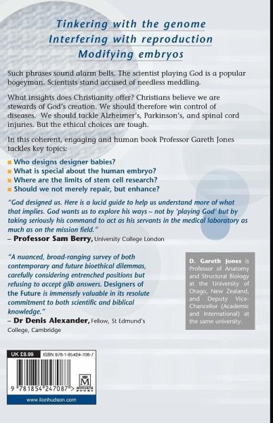 What insights does Christianity offer? Christians believe we are stewards of God's creation. We therefore should win control of diseases. We should tackle Alzheimer's, Parkinson's, and spinal cord injuries. But the ethical choices are tough. In this coherent, engaging book Professor Gareth Jones tackles: Who designs designer babies? What is special about the human embryo? What are the limits of stem cell research? Should we not merely repair, but enhance?