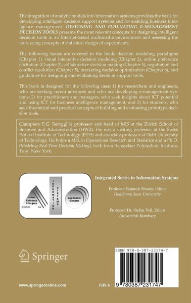 Designing and Evaluating E-Managemnet Decision Tools presents the most relevant concepts for designing intelligent decision tools in an Internet-based multimedia environment and assessing the tools using concepts of statistical design of experiments. The design principle is based on the visual interactive decision modeling (VIDEMO) paradigm. Several case studies are discussed in detail, referring to online preference elicitation, collaborative decision making, negotiation and conflict resolution, and marketing decision optimization.