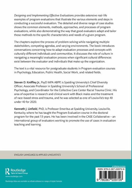 Designing and Implementing Effective Evaluations provides extensive real-life examples of program evaluations that illustrate the various elements and steps in conducting a successful evaluation. The detailed and diverse range of case studies show the common elements, methods, approaches, and processes of program evaluations, while also demonstrating the way that good evaluators adapt and tailor those methods to the specific characteristics and needs of a given program.