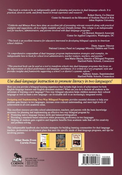 Foreword by Robert E. Slavin Preface About the Authors Part I: Starting Two-Way Bilingual Programs 1. Why Two-Way Bilingual Programs? 2. Planning and Designing Two-Way Bilingual Programs 3. Comprehensive Curriculum Models 4. Case Study: The Alicia R. Chacon International School Part II: Implementing Effective Instruction 5. Instructional Techniques and Activities for Second-Language Learners 6. Effective and Replicable Literacy Models 7. Using Writing to Promote Reading and Oral Language Development 8. Assessing Second-Language Learners Part III: Involving Teachers and Parents 9. Staff Development and Teacher Learning Communities 10. Reaching Out to Parents 11. Evaluation and Research Resource A: Resources for Two-Way Bilingual Programs Resource B: List of Acronyms References Index