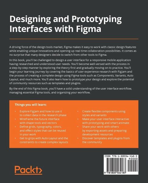 Discover user experience and user interface design best practices while mastering a wide array of tools across Figma and FigJam with this full-color guideKey FeaturesLearn the basics of user experience research, result organization, and analysis in FigJam Create mockups, interactive animations, and high-fidelity prototypes using this platform-independent web application tool Collaborate with a team in real-time and create, share, and test your designs Book Description A driving force of the design tools market, Figma makes it easy to work with classic design features while enabling unique innovations and opening up real-time collaboration possibilities. It comes as no surprise that many designers decide to switch from other tools to Figma. In this book, you'll be challenged to design a user interface for a responsive mobile application having researched and understood user needs. You'll become well-versed with the process in a step-by-step manner by exploring the theory first and gradually moving on to practice. You'll begin your learning journey by covering the basics of user experience research with FigJam and the process of creating a complete design using Figma tools such as Components, Variants, Auto Layout, and much more. You'll also learn how to prototype your design and explore the potential of community resources such as templates and plugins. By the end of this Figma book, you'll have a solid understanding of the user interface workflow, managing essential Figma tools, and organizing your workflow.What you will learnExplore FigJam and how to use it to collect data in the research phase Wireframe the future interface with shape tools and vectors Define grids, typography, colors, and effect styles that can be reused in your work Get to grips with Auto Layout and the constraints to create complex layouts Create flexible components using styles and variants Make your user interface interactive with prototyping and smart animate Share your work with others by exporting assets and preparing development resources Discover templates and plugins from the community Who this book is for This book is for aspiring UX/UI designers who want to get started with Figma as well as established designers who want to migrate to Figma from other design tools. This guide will take you through the entire process of creating a full-fledged prototype for a responsive interface using all the tools and features that Figma has to offer. As a result, this Figma design book is suitable for both UX and UI designers, product and graphic designers, and anyone who wants to explore the complete design process from scratch.Table of ContentsExploring Figma and Transitioning from Other Tools Structuring Moodboards, Personas, and User Flows within FigJam Getting to Know Your Design Environment Wireframing a Mobile-First Experience Using Vector Shapes Designing Consistently Using Grids, Colors, and Typography Creating a Responsive Mobile Interface Using Auto Layout Building Components and Variants in a Collaborative Workspace User Interface Design on Tablet, Desktop, and the Web Prototyping with Transitions, Smart Animate, and Interactive Components Testing and Sharing your Prototype on Browsers and Real Devices Exporting Assets and Managing the Handover Process Discovering Plugins and Resources in the Figma Community