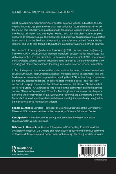 What do aspiring and practicing elementary science teacher education faculty need to know as they plan and carry out instruction for future elementary science teachers? This scholarly and practical guide for science teacher educators outlines the theory, principles, and strategies needed, and provides classroom examples anchored to those principles. The theoretical and empirical foundations are supported by scholarship in the field, and the practical examples are derived from activities, lessons, and units field-tested in the authors' elementary science methods courses. Designing and Teaching the Elementary Science Methods Course is grounded in the theoretical framework of pedagogical content knowledge (PCK), which describes how teachers transform subject matter knowledge into viable instruction in their discipline. Chapters on science methods students as learners, the science methods course curriculum, instructional strategies, methods course assessment, and the field experience help readers develop their PCK for teaching prospective elementary science teachers. "Activities that Work" and "Tools for Teaching the Methods Course" provide useful examples for putting this knowledge into action in the elementary science methods course.