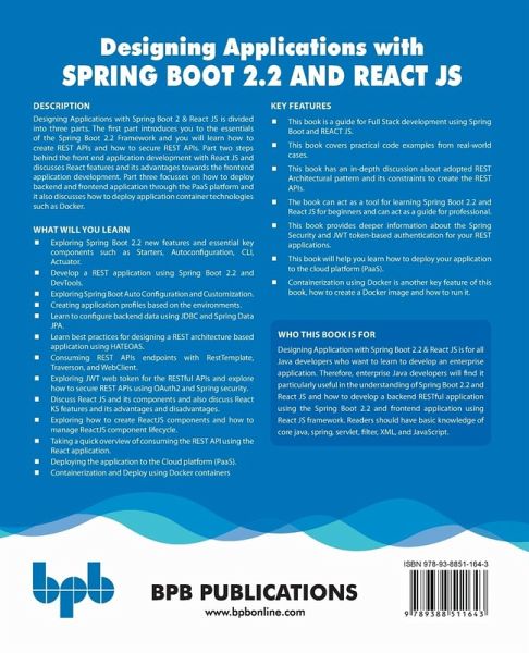 Let us full stack development with Spring Boot and React JS Key Features ¿ This book has a very specific goal to make developing REST applications easier and focusing on common challenges of the design of the application with best practices. ¿ This book is providing practical code examples from real-world experiences. ¿ This book is not only about Spring Boot 2.2 and React JS overview but also has an in-depth discussion about adopted REST Architectural pattern and its constraints to create the REST APIs. ¿ The book can act as a tool for learning Spring Boot 2.2 and React JS for the first time as well as a guide and reference for those wanting to dig deeper into specific features. ¿ This book is also providing deeper information about the Spring Security and JWT token-based authentication for your REST applications. ¿ Containerization using Docker is another key feature of this book, how to create a Docker image and how to run it. Description Designing Application with Spring Boot 2 & React JS is divided into three parts. The first part introduces you to the essentials of the Spring Boot 2.2 Framework and you will learn how to create REST APIs and how to secure REST APIs. Part 2 steps behind the front end application development with React JS and discuss React features and its advantages toward the frontend application development. Part 3 expands on that by showing how to deploy backend and frontend application the PaaS platform and also will discuss how to deploy application container technologies such as Docker. What will you learn ¿ Exploring Spring Boot 2.2 new features and essential key components such as Starters, Autoconfiguration, CLI, Actuator. ¿ Develop a REST application using Spring Boot 2.2 and DevTools. ¿ Exploring Spring Boot Auto Configuration and Customization. ¿ Creating application profiles based on the environments. ¿ Learn to configure backend data using JDBC and Spring Data JPA. ¿ Learn to configure a DataSource for H2 DB, and also for Maria DB. ¿ Learn best practices for designing a REST architecture based application. ¿ Creating a REST application using HATEOAS. ¿ Consuming REST APIs endpoints with RestTemplate, Traverson, and WebClient. ¿ Exploring JWT web token for the RESTful APIs and explores how to secure REST APIs using OAuth2 and Spring security. ¿ Creating TESTING module of the Spring Boot application and Unit & Integration testing. ¿ Discuss React JS and its components and also discuss React KS features and its advantages and disadvantage. ¿ Exploring how to create ReactJS components and how to manage ReactJS component lifecycle. ¿ Taking a quick overview of consuming the REST API using the React application. ¿ Deploying the application to the Cloud platform (PaaS). ¿ Containerization and Deploy using Docker containers Who This Book Is For For all Java developers who want to learn Spring Boot 2.2 and React JS as in the enterprise application. Therefore, enterprise Java developers will find it particularly useful in the understanding of Spring Boot 2.2 and React JS and how to develop a backend RESTful application using the Spring Boot 2.2 and frontend application using React JS framework. They will most fully appreciate the examples presented in this book. Before reading this book, readers should have basic knowledge of core java, spring, servlet, filter, XML, and JavaScript. Table of Contents 1. Getting Started with Spring Boot 2.2 2. Customizing Auto-Configuration 3. Configuring Data and CRUD operations 4. Creating REST APIs with Spring Boot 2.2 5. Securing REST APIs 6. Testing Spring Boot Application 7. Getting Started with React 8. Creating and Styling React Components 9. Consuming the REST API with React JS 10.Deploying and Containerizing Application