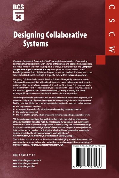 Designing Collaborative Systems: A Practical Guide to Ethnography introduces a new 'ethnographic' approach that will enable designers to create collaborative and interactive systems, which are employed successfully in real-world settings. This new approach, adapted from the field of social research, considers both the social circumstances and the level and type of human interaction involved, thereby ensuring that future ethnographic systems are as user-friendly and as effective as possible.