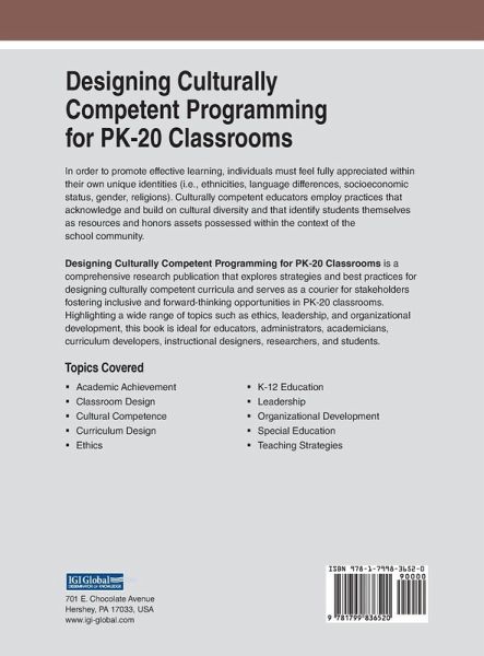 In order to promote effective learning, individuals must feel fully appreciated within their own unique identities (i.e., ethnicities, language differences, socioeconomic status, gender, religions). Culturally competent educators employ practices that acknowledge and build on cultural diversity and that identify students themselves as resources and honors assets possessed within the context of the school community. Designing Culturally Competent Programming for PK-20 Classrooms is a comprehensive research publication that explores strategies and best practices for designing culturally competent curricula and serves as a courier for stakeholders fostering inclusive and forward-thinking opportunities in PK-20 classrooms. Highlighting a wide range of topics such as ethics, leadership, and organizational development, this book is ideal for educators, administrators, academicians, curriculum developers, instructional designers, researchers, and students.