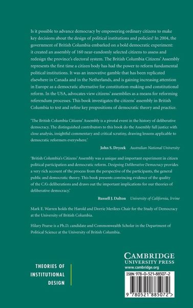 Is it possible to advance democracy by empowering ordinary citizens to make key decisions about the design of political institutions and policies? In 2004, the government of British Columbia embarked on a bold democratic experiment: it created an assembly of 160 near-randomly selected citizens to assess and redesign the province's electoral system. The British Columbia Citizens' Assembly represents the first time a citizen body has had the power to reform fundamental political institutions. It was an innovative gamble that has been replicated elsewhere in Canada and in the Netherlands, and is gaining increasing attention in Europe as a democratic alternative for constitution-making and constitutional reform. In the USA, advocates view citizens' assemblies as a means for reforming referendum processes. This book investigates the citizens' assembly in British Columbia to test and refine key propositions of democratic theory and practice.
