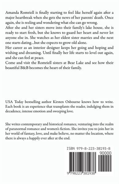 Amanda Romriell is finally starting to feel like herself again after a major heartbreak when she gets the news of her parents' death. Once again, she is reeling and wondering what else can go wrong. After she and her sisters move into their family's lake house, she is ready to start fresh, but she knows to guard her heart and never let anyone else in. She watches as her eldest sister marries and the next one starts dating…but she expects to grow old alone. Her career as an interior designer keeps her going and hoping and wishing and dreaming. Until finally her life starts to level out again, and she can feel at peace. Come and visit the Romriell sisters at Bear Lake and see how their beautiful B&B becomes the heart of their family.