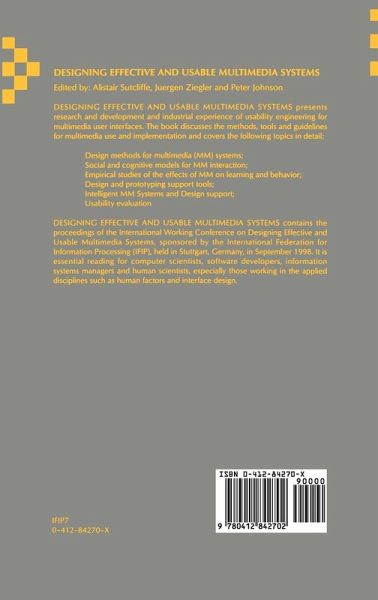 Designing Effective and Usable Multimedia Systems presents research and development and industrial experience of usability engineering for multimedia user interfaces. The book discusses the methods, tools and guidelines for multimedia use and implementation and covers the following topics in detail: Design methods for multimedia (MM) systems; Social and cognitive models for MM interaction; Empirical studies of the effects of MM on learning and behavior; Design and prototyping support tools; Intelligent MM Systems and Design support; Usability evaluation. £/LIST£ Designing Effective and Usable Multimedia Systems contains the proceedings of the International Working Conference on Designing Effective and usable Multimedia Systems, sponsored by the International Federation for Information Processing (IFIP), held in Stuttgart, Germany, in September 1998. It is essential reading for computer scientists, software developers, information systems managers and human scientists, especially those working in the applied disciplines such as human factors and interface design.
