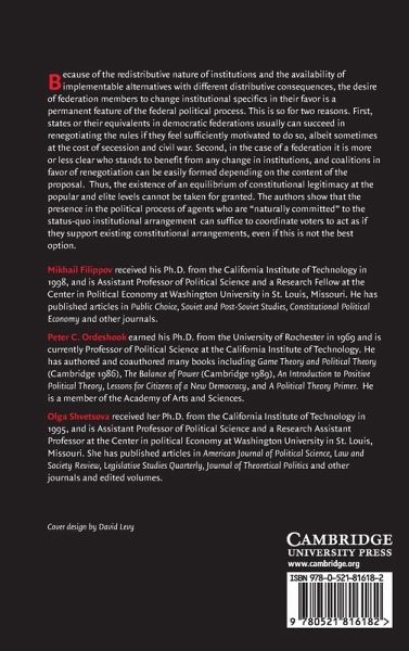 The design of federal states from Russia and the Ukraine to Canada and the European Union typically develops from a false set of assumptions regarding the institutional building blocks of such a state. Rather than any carefully delineated allocation of policy jurisdictions, the authors argue that a number of institutional variables, not normally associated with federal design, can be critical in determining federal success. (The variables are the content of regional charters and the extent to which public offices are filled by election rather than appointment.)