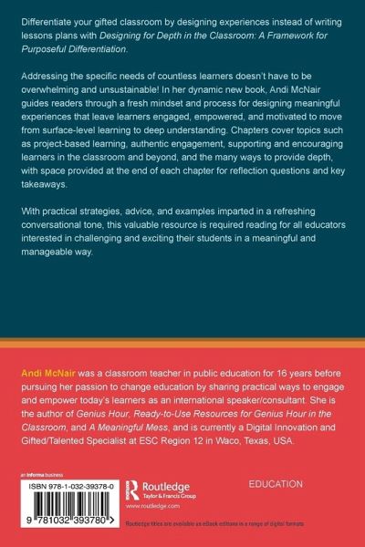 Andi McNair was a classroom teacher in public education for 16 years before pursuing her passion to change education by sharing practical ways to engage and empower today's learners as an international speaker/consultant. She is the author of Genius Hour, Ready-to-Use Resources for Genius Hour in the Classroom, and A Meaningful Mess, and is currently a Digital Innovation and Gifted/Talented Specialist at ESC Region 12 in Waco, Texas, USA.