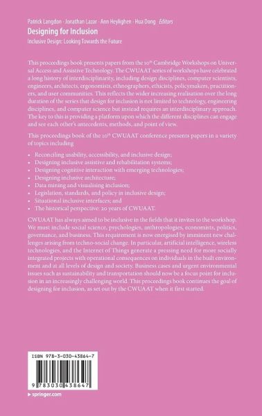 This proceedings book presents papers from the 10th Cambridge Workshops on Universal Access and Assistive Technology. The CWUAAT series of workshops have celebrated a long history of interdisciplinarity, including design disciplines, computer scientists, engineers, architects, ergonomists, ethnographers, ethicists, policymakers, practitioners, and user communities. This reflects the wider increasing realisation over the long duration of the series that design for inclusion is not limited to technology, engineering disciplines, and computer science but instead requires an interdisciplinary…mehr