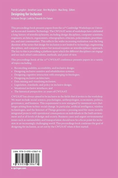 CWUAAT has always aimed to be inclusive in the fields that it invites to the workshop. We must include social science, psychologies, anthropologies, economists, politics, governance, and business. This requirement is now energised by imminent new challenges arising from techno-social change. In particular, artificial intelligence, wireless technologies, and the Internet of Things generate a pressing need for more socially integrated projects with operational consequences on individuals in the built environment and at all levels of design and society. Business cases and urgent environmental issues such as sustainability and transportation should now be a focus point for inclusion in an increasingly challenging world. This proceedings book continues the goal of designing for inclusion, as set out by the CWUAAT when it first started.