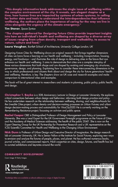 Christopher T. Boyko is a 50th Anniversary Lecturer in Design at Lancaster University. He explores critical connections between urban design and behaviour, informing both design practice and policy. He has undertaken research on the relationship between wellbeing, sharing, and neighbourhoods for the Liveable Cities project; urban density and decision-making processes on Urban Futures; and urban design decision-making process and sustainability for VivaCity2020. He is currently working on the Remembering Resistance project, focussing on activism and public space. Rachel Cooper OBE is Distinguished Professor of Design Management and Policy at Lancaster University. She was a Lead Expert for the UK Government Foresight programme on the Future of Cities, and the Academy of Medical Sciences addressing 'the health of the public 2040'. She is now on the Expert Steering Group for the UK Partnership for Prevention Research and a UK representative on the ICSU Scientific Committee for Health and Wellbeing in the Changing Urban Environment. Nick Dunn is Professor of Urban Design and Executive Director of Imagination, the design research lab at Lancaster University, UK. He is Senior Fellow at the Institute for Social Futures, exploring new ways to envision and analyse the futures of people, places, and planet. He has authored numerous books, journal articles, and commissioned reports. Nick's expertise on cities, design, futures, and health has led to curated exhibitions and keynotes around the world.