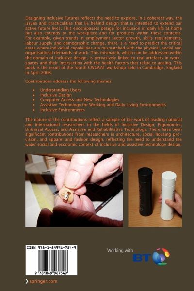 "Designing Inclusive Futures" reflects the need to explore, in a coherent way, the issues and practicalities that lie behind design that is intended to extend our active future lives. This encompasses design for inclusion in daily life at home but also extends to the workplace and for products within these contexts. For example, given trends in employment sector growth, skills requirements, labour supply and demographic change, there is a need to predict the critical areas where individual capabilities are mismatched with the physical, social and organisational demands of work. This mismatch, which can be addressed within the domain of inclusive design, is pervasively linked to real artefacts in workspaces and their intersection with the health factors that relate to ageing. This book is the result of the fourth CWUAAT workshop held in Cambridge, England in April 2008.