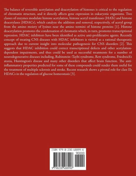 The balance of reversible acetylation and deacetylation of histones is critical to the regulation of chromatin structure, and it directly affects gene expression in eukaryotic organisms. Two classes of enzymes modulate histone acetylation, histone acetyl transferases (HATs) and histone deacetylases (HDACs), which catalyze the addition and removal, respectively, of acetyl group from the amino moiety of lysines near the amino termini of histone proteins [1]. Histone deacetylation promotes the condensation of chromatin which, in turn, promotes transcriptional repression. HDAC inhibitors have been identified as active anti-proliferative agents. Recently concept of treating CNS diseases with HDAC inhibitors is viewed as a rational therapeutic approach due to current insight into molecular pathogenesis for CNS disorders [2]. This suggests that HDAC inhibition could correct transcriptional defects and other acetylation-dependent impairments, and thus could be used as successful treatments for a number of neurodegenerative diseases including, Rubinstein-Taybi syndrome, Rett syndrome, Friedreich's ataxia, Huntington's disease and many other disorders that affect brain function. The anti-inflammatory properties predicted for some of these compounds could render them useful for the treatment of multiple sclerosis and stroke. Recent research shows a pivotal role for class IIa HDACs in the regulation of glucose homeostasis [3].