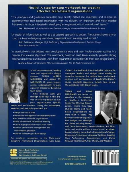 From the authors of Designing Team-Based Organizations, hands-on guidance for establishing or refining teams in organizations where they carry out the core work process.Though teams are fast becoming the basic foundation of businesses and other organizations, surprisingly few resources are available to help managers, leaders, and design teams organize an entire business or business unit around teams. In response to requests from their consulting clients, including Texas Instruments and Honeywell, the Mohrmans developed these step-by-step materials.Their workbook is a practical guide that combines basic concepts with dozens of valuable worksheets that team organizers can use to create a viable design plan. Attractively designed with clear graphics, sidebars, to-do lists, and diagnostic aids, the workbook details planning, design, goals, decision-making, communications, leadership roles, performance management, and more. The facilitator's guide outlines how to use the workbook with groups so that unit managers, project managers, design professionals, and human resource staffs can work efficiently with their management teams to design or redesign their groups around teams.