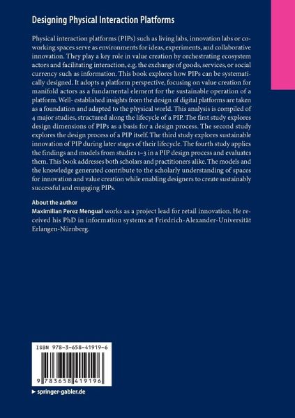 Physical interaction platforms (PIPs) such as living labs, innovation labs or co-working spaces serve as environments for ideas, experiments, and collaborative innovation. They play a key role in value creation by orchestrating ecosystem actors and facilitating interaction, e.g. the exchange of goods, services, or social currency such as information. This book explores how PIPs can be systematically designed. It adopts a platform perspective, focusing on value creation for manifold actors as a fundamental element for the sustainable operation of a platform. Well-established insights from the design of digital platforms are taken as a foundation and adapted to the physical world. This analysis is compiled of 4 major studies, structured along the lifecycle of a PIP. The first study explores design dimensions of PIPs as a basis for a design process. The second study explores the design process of a PIP itself. The third study explores sustainable innovation of PIP during later stages of their lifecycle. The fourth study applies the findings and models from studies 1-3 in a PIP design process and evaluates them. This book addresses both scholars and practitioners alike. The models and the knowledge generated contribute to the scholarly understanding of spaces for innovation and value creation while enabling designers to create sustainably successful and engaging PIPs.
