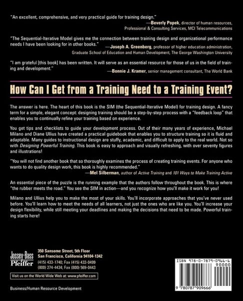 A friendly, nonacademic guide to instructional design and training implementation. This book is a practical, how-to guide to designing training for adults. It answers the question: "What do I do to get from a training need to a training event?" The heart of this book is the Sequential-Iterative Model (SIM) for training design. The SIM is a process with a "feedback loop" that enables trainers to continually refine their training based on experience. Training designers will use this revolutionary model to structure training so it is fluid and adaptable. Most guides to instructional design are stuffy, academic, and difficult to apply to the real world. Not so with Designing Powerful Training. This book is easy to approach and full of illustrations. Effective training must be open to change. Neophytes and pro trainers, as well as instructional designers, will find this quick-reading handbook essential to dynamic training design.