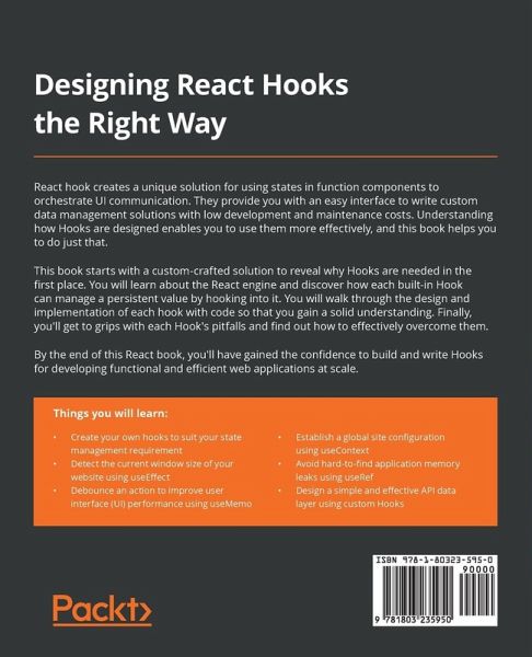 Get to grips with React Hooks and design your own custom Hook to manage application states for making better decisions in site architecture Key Features:Get to grips with Hooks' design and understand each built-in Hook's pitfalls with examples Discover how to turn your existing code into a reusable Hook via code refactoring Explore design solutions to identify and solve site performance issues involving Hooks Book Description: React hook creates a unique solution for using states in function components to orchestrate UI communication. They provide you with an easy interface to write custom data management solutions with low development and maintenance costs. Understanding how Hooks are designed enables you to use them more effectively, and this book helps you to do just that. This book starts with a custom-crafted solution to reveal why Hooks are needed in the first place. You will learn about the React engine and discover how each built-in Hook can manage a persistent value by hooking into it. You will walk through the design and implementation of each hook with code so that you gain a solid understanding. Finally, you'll get to grips with each Hook's pitfalls and find out how to effectively overcome them. By the end of this React book, you'll have gained the confidence to build and write Hooks for developing functional and efficient web applications at scale. What You Will Learn:Create your own hooks to suit your state management requirement Detect the current window size of your website using useEffect Debounce an action to improve user interface (UI) performance using useMemo Establish a global site configuration using useContext Avoid hard-to-find application memory leaks using useRef Design a simple and effective API data layer using custom Hooks Who this book is for: This book is for web developers who are looking for a consistent and efficient approach for applying application states with Hooks. Basic knowledge of React will help you to get the most out of this book.