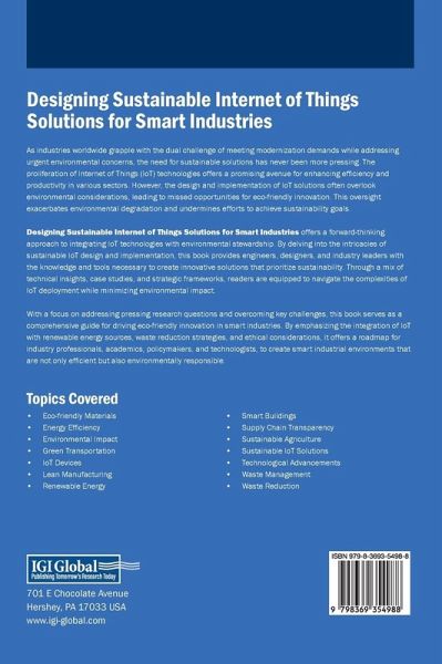 As industries worldwide grapple with the dual challenge of meeting modernization demands while addressing urgent environmental concerns, the need for sustainable solutions has never been more pressing. The proliferation of Internet of Things (IoT) technologies offers a promising avenue for enhancing efficiency and productivity in various sectors. However, the design and implementation of IoT solutions often overlook environmental considerations, leading to missed opportunities for eco-friendly innovation. This oversight exacerbates environmental degradation and undermines efforts to achieve sustainability goals. Designing Sustainable Internet of Things Solutions for Smart Industries offers a forward-thinking approach to integrating IoT technologies with environmental stewardship. By delving into the intricacies of sustainable IoT design and implementation, this book provides engineers, designers, and industry leaders with the knowledge and tools necessary to create innovative solutions that prioritize sustainability. Through a mix of technical insights, case studies, and strategic frameworks, readers are equipped to navigate the complexities of IoT deployment while minimizing environmental impact.