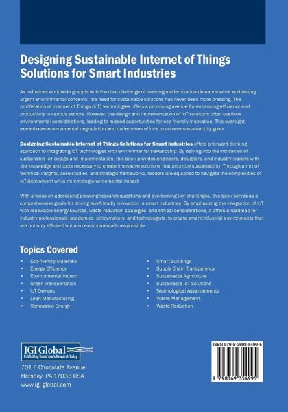 As industries worldwide grapple with the dual challenge of meeting modernization demands while addressing urgent environmental concerns, the need for sustainable solutions has never been more pressing. The proliferation of Internet of Things (IoT) technologies offers a promising avenue for enhancing efficiency and productivity in various sectors. However, the design and implementation of IoT solutions often overlook environmental considerations, leading to missed opportunities for eco-friendly innovation. This oversight exacerbates environmental degradation and undermines efforts to achieve sustainability goals. Designing Sustainable Internet of Things Solutions for Smart Industries offers a forward-thinking approach to integrating IoT technologies with environmental stewardship. By delving into the intricacies of sustainable IoT design and implementation, this book provides engineers, designers, and industry leaders with the knowledge and tools necessary to create innovative solutions that prioritize sustainability. Through a mix of technical insights, case studies, and strategic frameworks, readers are equipped to navigate the complexities of IoT deployment while minimizing environmental impact.
