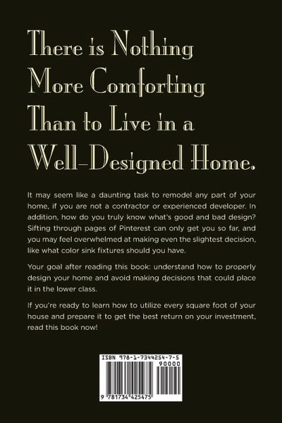 There is Nothing More Comforting Than to Live in a Well-Designed Home. It may seem like a daunting task to remodel any part of your home, if you are not a contractor or experienced developer. In addition, how do you truly know what's good and bad design? Sifting through pages of Pinterest can only get you so far, and you may feel overwhelmed at making even the slightest decision, like what color sink fixtures should you have. Your goal after reading this book: understand how to properly design your home and avoid making decisions that could place it in the lower class. If you're ready to learn how to utilize every square foot of your house and prepare it to get the best return on your investment, read this book now!