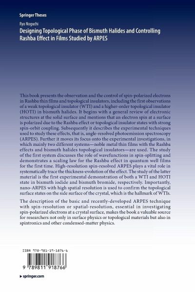 This book presents the observation and the control of spin-polarized electrons in Rashba thin films and topological insulators, including the first observations of a weak topological insulator (WTI) and a higher-order topological insulator (HOTI) in bismuth halides. It begins with a general review of electronic structures at the solid surface and mentions that an electron spin at a surface is polarized due to the Rashba effect or topological insulator states with strong spin-orbit coupling. Subsequently it describes the experimental techniques used to study these effects, that is, angle-resolved photoemission spectroscopy (ARPES). Further it moves its focus onto the experimental investigations, in which mainly two different systems-noble metal thin films with the Rashba effects and bismuth halides topological insulators-are used. The study of the first system discusses the role of wavefunctions in spin-splitting and demonstrates a scaling law for the Rashba effect in quantum well films for the first time. High-resolution spin-resolved ARPES plays a vital role in systematically trace the thickness-evolution of the effect. The study of the latter material is the first experimental demonstration of both a WTI and HOTI state in bismuth iodide and bismuth bromide, respectively. Importantly, nano-ARPES with high spatial resolution is used to confirm the topological surface states on the side surface of the crystal, which is the hallmark of WTIs.