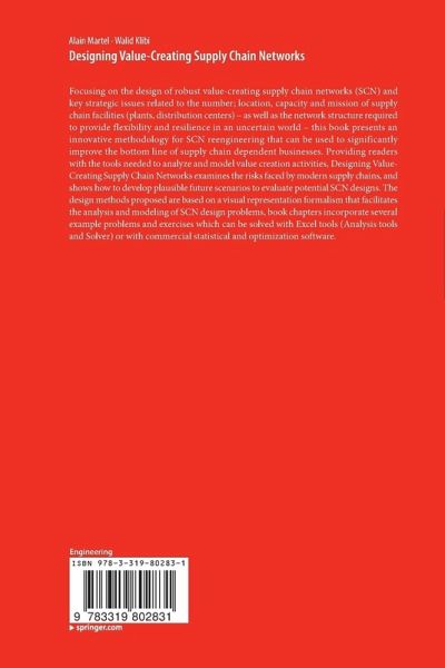 Winner of the 2016 Coup de Coeur prize at the Plumes des Achats & Supply Chain, Paris. Focusing on the design of robust value-creating supply chain networks (SCN) and key strategic issues related to the number; location, capacity and mission of supply chain facilities (plants, distribution centers) - as well as the network structure required to provide flexibility and resilience in an uncertain world - this book presents an innovative methodology for SCN reengineering that can be used to significantly improve the bottom line of supply chain dependent businesses. Providing readers with the tools needed to analyze and model value creation activities, Designing Value-Creating Supply Chain Networks examines the risks faced by modern supply chains, and shows how to develop plausible future scenarios to evaluate potential SCN designs. The design methods proposed are based on a visual representation formalismthat facilitates the analysis and modeling of SCN design problems, book chapters incorporate several example problems and exercises which can be solved with Excel tools (Analysis tools and Solver) or with commercial statistical and optimization software.