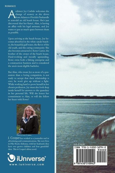 Architect Joy Carlisle welcomes the change of scenery as she drives from Atlanta to Florida's Panhandle to remodel an old beach house. She's just discovered that her fiancé, Alan, is having an affair with his legal assistant, and Joy wants to put as much space between them as possible. Upon arriving at the beach house, Joy becomes absorbed in the white sandy beaches, the beautiful gulf water, the flavor of the old south, and the caring community. She also becomes attracted to Rowe Cutter, the brother of the owner of the beach house. Hard-working and morally upstanding, Rowe owns both a fishing enterprise and a construction business and is considered the area's most eligible bachelor. But Alan, who treats Joy as more of a possession than a loving companion, is not ready to accept that their relationship is over; he won't give up without a fight. While working hard to prove herself in her chosen profession, Joy must also look deep inside herself for answers to the quandary in her personal life. Will she honor her commitment to Alan, or will she follow her heart with Rowe?