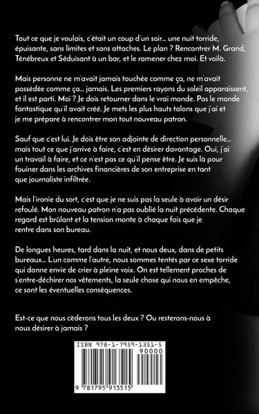 Tout ce que je voulais, c'était un coup d'un soir... une nuit torride, épuisante, sans limites et sans attaches. Le plan? Rencontrer M. Grand, Ténébreux et Séduisant à un bar, et le ramener chez moi. Et voilà. Mais personne ne m'avait jamais touchée comme ça, ne m'avait possédée comme ça... jamais. Les premiers rayons du soleil apparaissent, et il est parti. Moi? Je dois retourner dans le vrai monde. Pas le monde fantastique qu'il avait créé. Je mets les plus hauts talons que j'ai et je me prépare à rencontrer mon tout nouveau patron. Sauf que c'est lui. Je dois être son adjointe de direction personnelle... mais tout ce que j'arrive à faire, c'est en désirer davantage. Oui, j'ai un travail à faire, et ce n'est pas ce qu'il pense être. Je suis là pour fouiner dans les archives financières de son entreprise en tant que journaliste infiltrée. Mais l'ironie du sort, c'est que je ne suis pas la seule à avoir un désir refoulé. Mon nouveau patron n'a pas oublié la nuit précédente. Chaque regard est brûlant et la tension monte à chaque fois que je rentre dans son bureau. De longues heures, tard dans la nuit, et nous deux, dans de petits bureaux... L'un comme l'autre, nous sommes tentés par ce sexe torride qui donne envie de crier à pleine voix. On est tellement proches de s'entre-déchirer nos vêtements, la seule chose qui nous en empêche, ce sont les éventuelles conséquences. Est-ce que nous cèderons tous les deux? Ou resterons-nous à nous désirer à jamais?