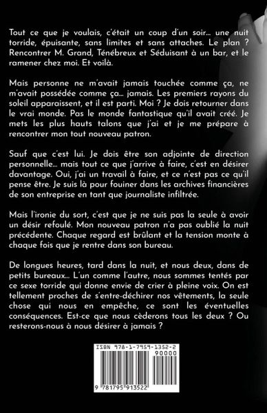 Tout ce que je voulais, c'était un coup d'un soir... une nuit torride, épuisante, sans limites et sans attaches. Le plan? Rencontrer M. Grand, Ténébreux et Séduisant à un bar, et le ramener chez moi. Et voilà. Mais personne ne m'avait jamais touchée comme ça, ne m'avait possédée comme ça... jamais. Les premiers rayons du soleil apparaissent, et il est parti. Moi? Je dois retourner dans le vrai monde. Pas le monde fantastique qu'il avait créé. Je mets les plus hauts talons que j'ai et je me prépare à rencontrer mon tout nouveau patron. Sauf que c'est lui. Je dois être son adjointe de direction personnelle... mais tout ce que j'arrive à faire, c'est en désirer davantage. Oui, j'ai un travail à faire, et ce n'est pas ce qu'il pense être. Je suis là pour fouiner dans les archives financières de son entreprise en tant que journaliste infiltrée. Mais l'ironie du sort, c'est que je ne suis pas la seule à avoir un désir refoulé. Mon nouveau patron n'a pas oublié la nuit précédente. Chaque regard est brûlant et la tension monte à chaque fois que je rentre dans son bureau. De longues heures, tard dans la nuit, et nous deux, dans de petits bureaux... L'un comme l'autre, nous sommes tentés par ce sexe torride qui donne envie de crier à pleine voix. On est tellement proches de s'entre-déchirer nos vêtements, la seule chose qui nous en empêche, ce sont les éventuelles conséquences. Est-ce que nous cèderons tous les deux? Ou resterons-nous à nous désirer à jamais?