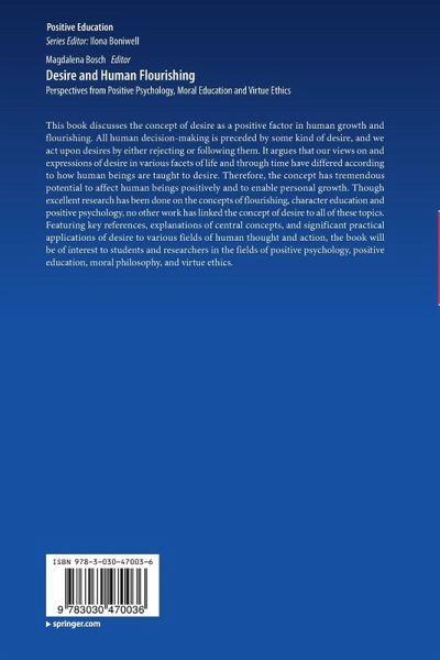 This book discusses the concept of desire as a positive factor in human growth and flourishing. All human decision-making is preceded by some kind of desire, and we act upon desires by either rejecting or following them. It argues that our views on and expressions of desire in various facets of life and through time have differed according to how human beings are taught to desire. Therefore, the concept has tremendous potential to affect human beings positively and to enable personal growth. Though excellent research has been done on the concepts of flourishing, character education and positive psychology, no other work has linked the concept of desire to all of these topics. Featuring key references, explanations of central concepts, and significant practical applications of desire to various fields of human thought and action, the book will be of interest to students and researchers in the fields of positive psychology, positive education, moral philosophy, and virtue ethics.