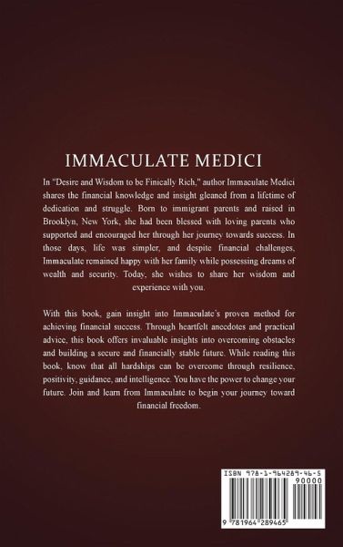 "Author Immaculate Medici shares the financial knowledge and insight gleaned from a lifetime of dedication and struggle. Born to immigrant parents and raised in Brooklyn, New York, she had been blessed with loving parents who supported and encouraged her through her journey towards success. In those days, life was simpler, and despite financial challenges, Immaculate remained happy with her family while possessing dreams of wealth and security. Today, she wishes to share her wisdom and experience with you.With this book, gain insight into Immaculate's proven method for achieving financial success. Through heartfelt anecdotes and practical advice, this book offers invaluable insights into overcoming obstacles and building a secure and financially stable future. While reading this book, know that all hardships can be overcome through resilience, positivity, guidance, and intelligence. You have the power to change your future. Join and learn from Immaculate to begin your journey toward financial freedom."