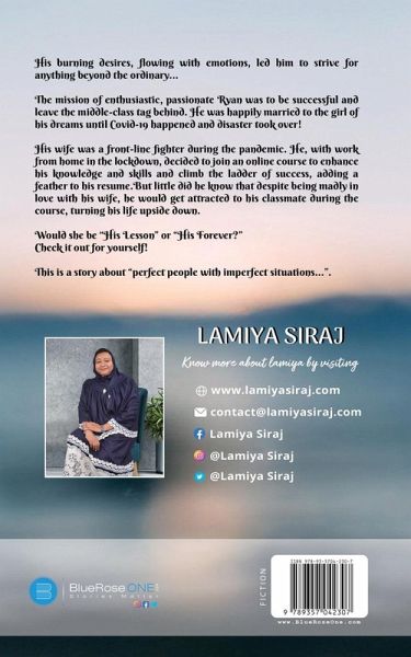 " His burning desires, flowing with emotions, led him to strive for anything beyond the ordinary... The mission of enthusiastic, passionate Ryan was to be successful and leave the middle-class tag behind. He was happily married to the girl of his dreams until Covid-19 happened and disaster took over! His wife was a front-line fighter during the pandemic. He, with work from home in the lockdown, decided to join an online course to enhance his knowledge and skills and climb the ladder of success, adding a feather to his resume. But little did he know that despite being madly in love with his wife, he would get attracted to his classmate during the course, turning his life upside down. Would she be "His Lesson" or "His Forever?" Check it out for yourself! This is a story about "perfect people with imperfect situations...""