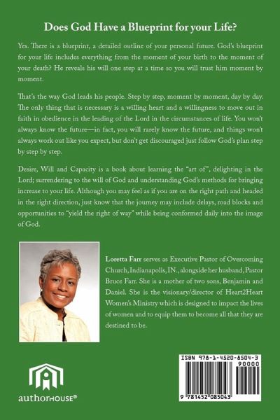 Does God Have a Blueprint for your Life? Yes. There is a blueprint, a detailed outline of your personal future. God's blueprint for your life includes everything from the moment of your birth to the moment of your death? He reveals his will one step at a time so you will trust him moment by moment. That's the way God leads his people. Step by step, moment by moment, day by day. The only thing that is necessary is a willing heart and a willingness to move out in faith in obedience in the leading of the Lord in the circumstances of life. You won't always know the future-in fact, you will rarely know the future, and things won't always work out like you expect, but don't get discouraged just follow God's plan step by step by step. Desire, Will and Capacity is a book about learning the "art of", delighting in the Lord; surrendering to the will of God and understanding God's methods for bringing increase to your life. Although you may feel as if you are on the right path and headed in the right direction, just know that the journey may include delays, road blocks and opportunities to "yield the right of way" while being conformed daily into the image of God.